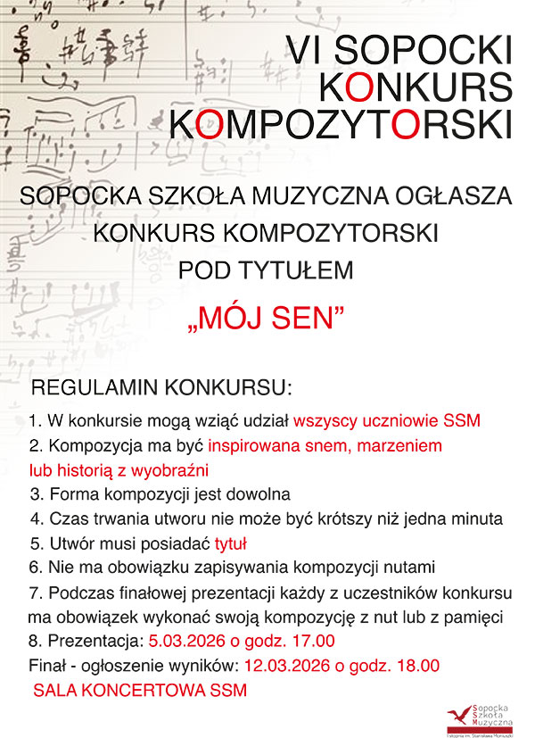 Zapraszamy do udziału w Konkursie kompozytorskim „Mój sen” 13.sty. 2026 Zapraszamy do udziału w Konkursie kompozytorskim „Mój sen”. Szczegóły poniżej.