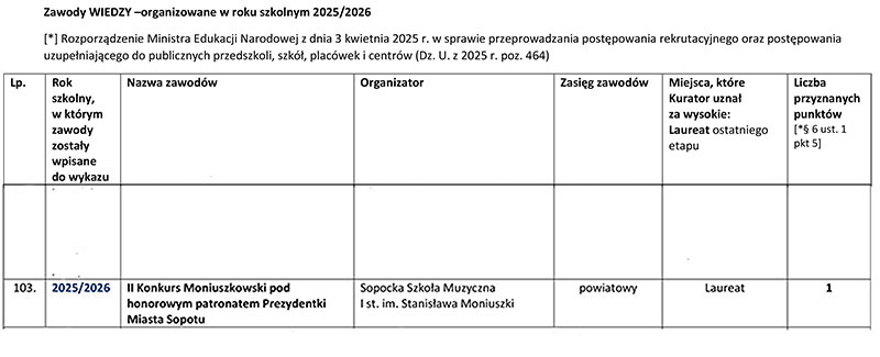 Miło nam poinformować, że Konkurs wiedzy o życiu i twórczości Stanisława Moniuszki, pod honorowym patronatem Prezydentki Miasta Sopotu, organizowany przez Sopocką Szkołę Muzyczną I stopnia imienia Stanisława Moniuszki w Sopocie został wpisany do kuratoryjnego wykazu konkursów wiedzy!