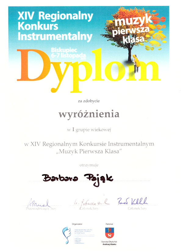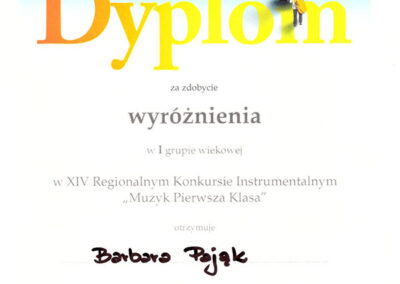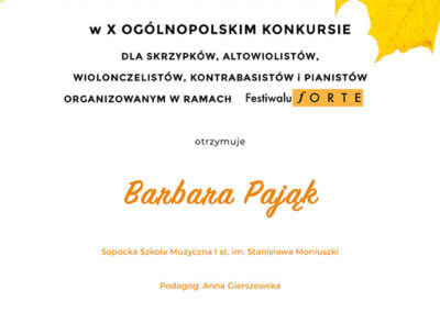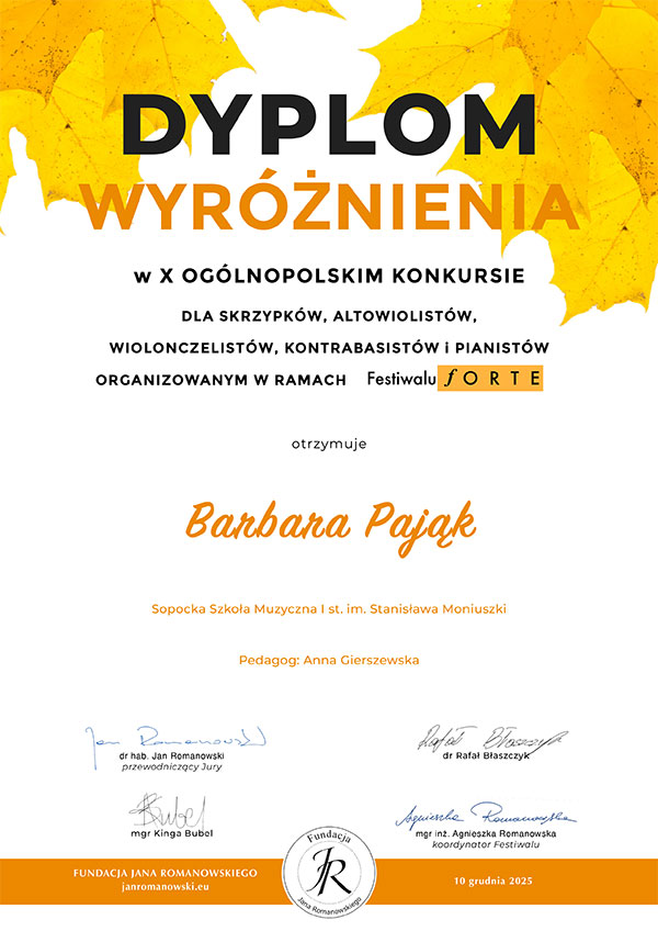 Basia została również doceniona i wyróżniona przez jury na XIV Regionalnym Konkursie Instrumentalnym „Muzyk pierwsza klasa” w Biskupcu, który odbył się w dniach 6-7.11.2025 a także zdobyła wyróżnienie na X Ogólnopolskim Konkursie w ramach Festiwalu FORTE /10.12.2025/