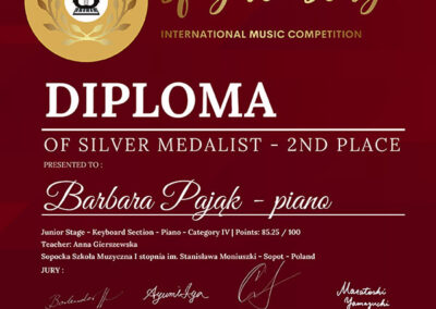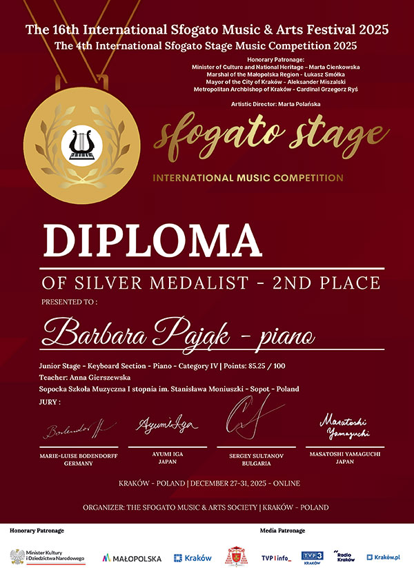 Z dumą informujemy, że Barbara Pająk, uczennica klasy 2 cyklu 6- letniego z klasy fortepianu pani Anny Gierszewskiej zdobyła II miejsce SILVER DIPLOMA podczas 16th International Sfogato Music and Arts Festival 2025, który odbył się w dniach 27-31.12.2025 /edycja on-line w Krakowie/, gdzie międzynarodowe jury doceniło talent Basi i zaprosiło w ramach nagrody do uczestnictwa w koncercie laureatów Sfogato Stage w siedzibie Mendelssohn Gesellschaft w Berlinie 25 kwietnia 2026 roku.